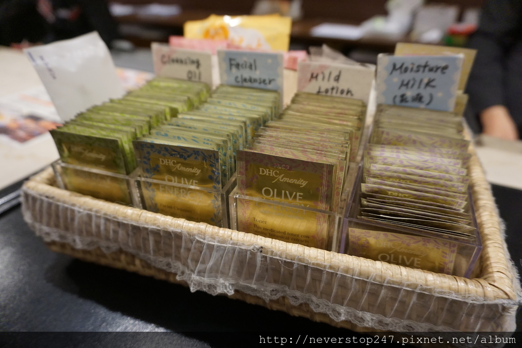 在飯店登記入住時,櫃台人員會讓客人選擇美試用包,都是DHC的,看起來台灣沒有(因為沒看過台灣DHC試用包),每個人可以任選三包,女生應該會覺得很貼心